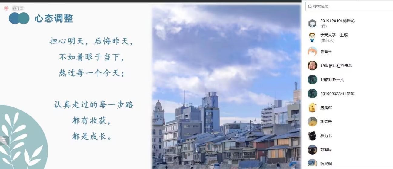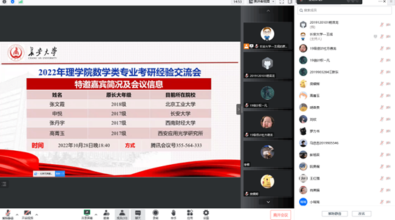 为助力学生考研、解答考研疑惑、增强考研信心。10月28日,beat365体育官方网站2019级数学类专业通过腾讯会议举办了考研经验交流会,会议邀请到我院2021届和2022届优秀校友,现为北京工业大学、长安大学、西南财经大学和西安应用光学研究所研究生的张文霞、申悦、张丹宇和高菁玉同学为同学们举办了考研经验交流会。会议由思政班主任王成主持,近50位同学参加了本次交流会。